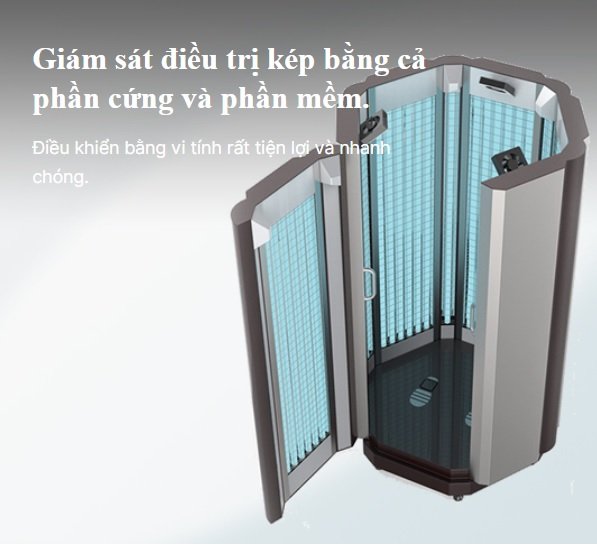 Thiết bị thường có dạng buồng chiếu toàn thân, giúp ánh sáng phân bố đồng đều lên toàn bộ bề mặt da, phù hợp cho các bệnh lý da lan tỏa.